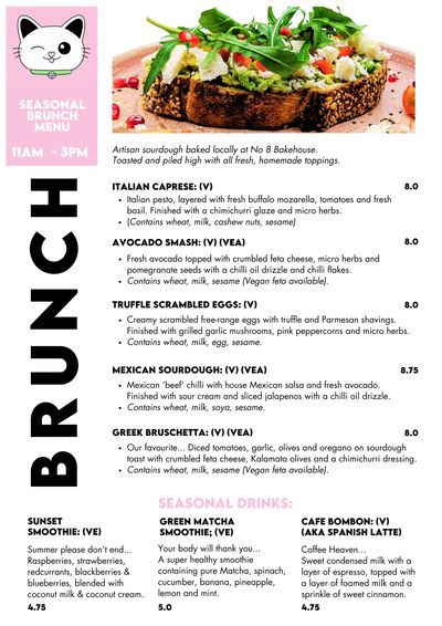 We have introduced an additional brunch menu to complement our sandwiches, pancakes and Acai bowls. Our selection of fresh Sourdough Toasts uses only the best artisan sourdough from No 8 Bakery, piled high with delicious fresh, seasonal toppings... sure to satisfy those that prefer something savoury!