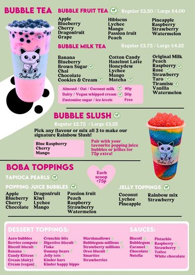 At BobaCat, we have a passion for bubble tea and a goal to share our unique and delicious drink. We wanted to introduce it to a new audience of people that had never tried it before, as well as those who already love it! We make it a fun experience in friendly and cosy surroundings. We believe that everyone deserves to experience the joy and refreshment that bubble tea can bring.