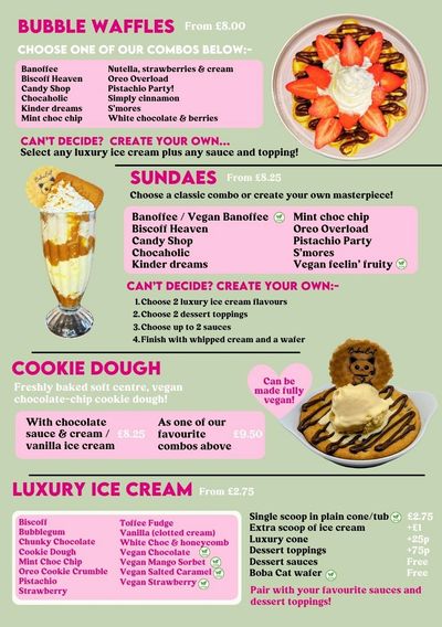 Our cookie dough is cooked in-house fresh to order using our own delicious and fully vegan recipe. They are topped with chocolate sauce and ice cream. Alternatively you can choose from out indulgent toppings to create your own or choose one of our favourites from the menu. Can be made fully vegan!